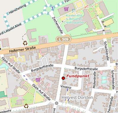 | - | [[Datei:Ausschnitt_Fundpunkt_Openstreetmap.jpg|400px|thumb|Ort (Fundpunkt) der Mutungsbohrung auf Steinkohle -FL II, 1902- | + | [[Datei:Ausschnitt_Fundpunkt_Openstreetmap.jpg|center|400px|thumb|Ort (Fundpunkt) der Mutungsbohrung auf Steinkohle -FL II, 1902- |